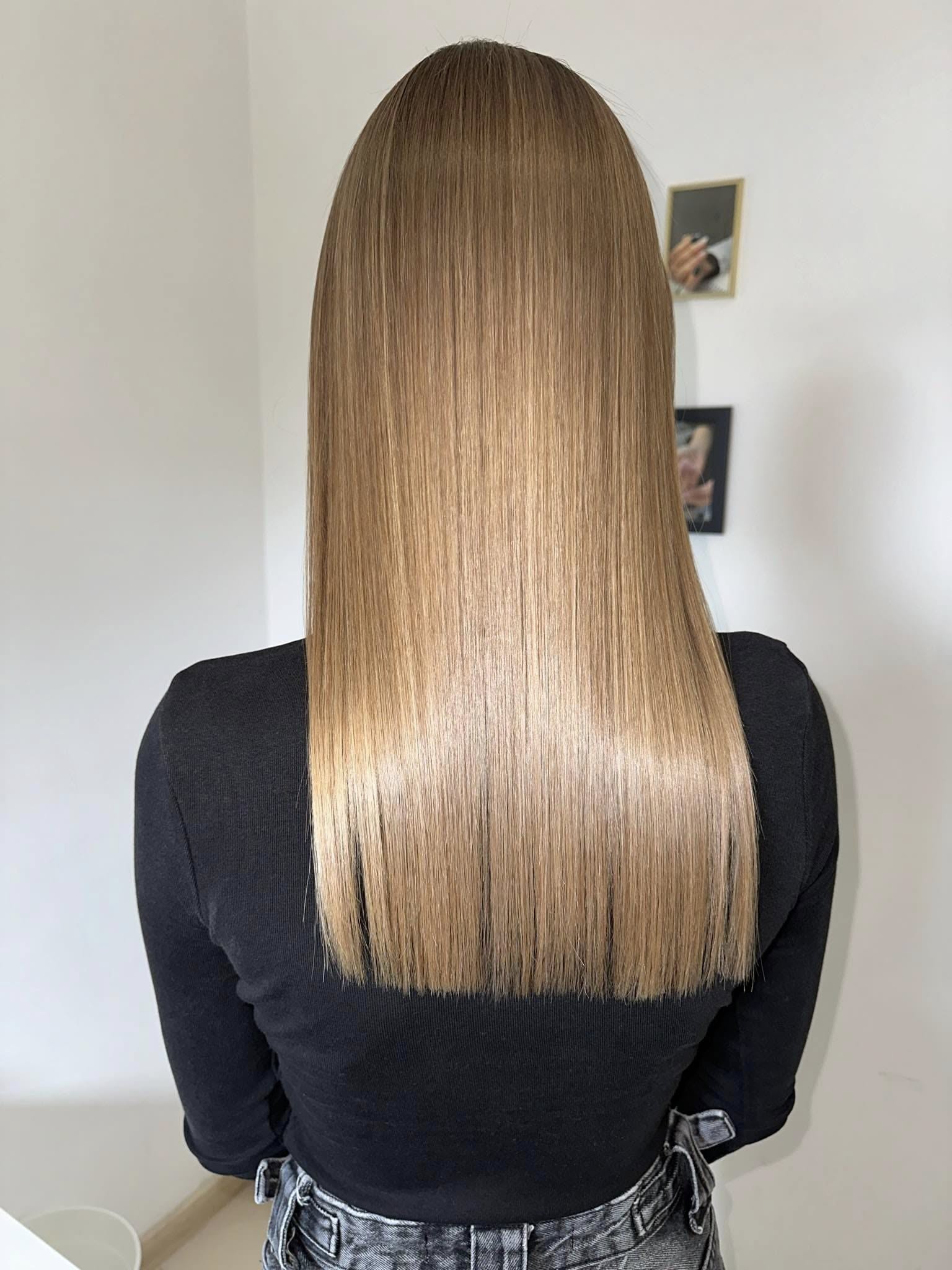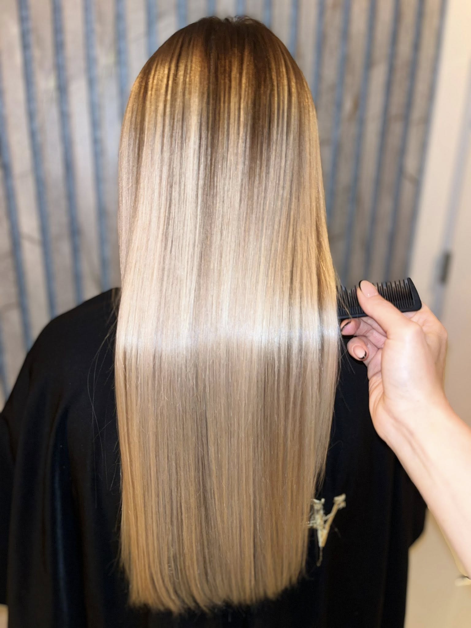 Professional salon treatment for straight, smooth, frizz-free hair with mirror-like shine. Rebuilds hair structure with amino acids, Allium Cepa extract, cysteine, cysteamine, and plant oils and butters. Strengthens, protects colour, neutralises yellow tones, and improves elasticity—all without smoke, formaldehyde, or unpleasant odour.