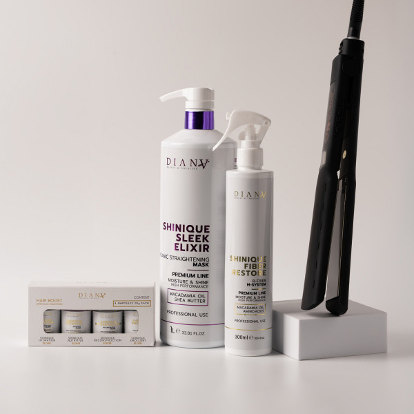 The Shinique Signature Bundle is the complete professional bundle for sleek, strong, and smooth hair. It includes the Shinique Sleek Elixir, Fiber Restore, Boost ampoules, and premium Diana salon tools — everything a stylist needs to deliver flawless, long-lasting smoothing, straightening, and repair results.